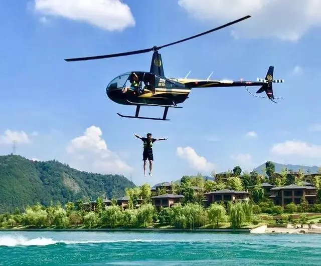 顧名思義,直升機(jī)跳水就是人從懸停的直升機(jī)上跳出,在空中經(jīng)過(guò)一段自由落體后,進(jìn)入千島湖清澈涼爽的湖水之中。