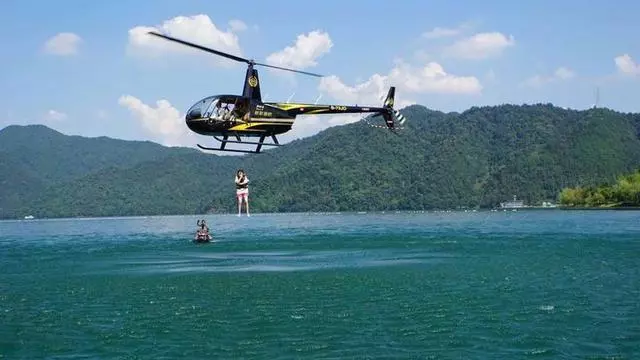 7月30日上午10點(diǎn),隨著一架黑金涂裝的羅賓遜R44直升機(jī)在千島湖畔載著游客騰空而起,低空旅游+直升機(jī)跳水(HELI-DIVING)項(xiàng)目在建德精彩亮相。