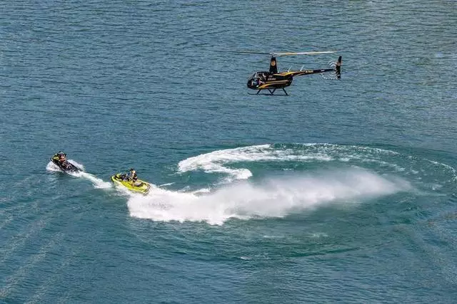 挑戰(zhàn)者先乘坐直升機(jī)到達(dá)高空,準(zhǔn)備完畢后,站在直升機(jī)的滑撬上,從水面上空約5米處一躍而下,短短幾秒鐘內(nèi),就從直升機(jī)上跳入水中。
